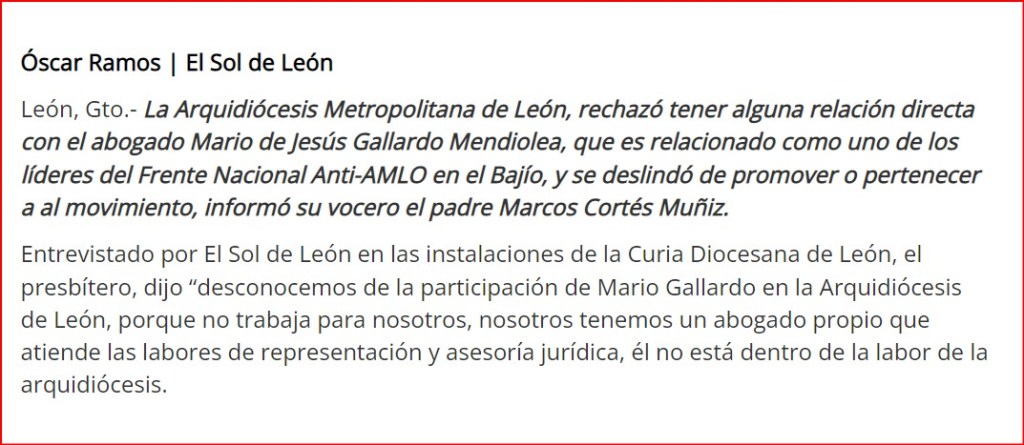 III. Se hizo pasar por asesor jurídico de la Arquidiócesis de León siendo DESMENTIDO POR LAS AUTORIDADES ECLESIASTICAS.